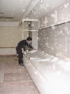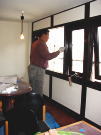 |  |  |  | 2/14/’08 ・剥げかかっていた窓枠の塗装を濃い古色に上塗り しています。 ・キッチンカウンターができました。天板は濃い古色で塗装。 ・展示ケースの床に長尺シートを貼っているところ。 | ||