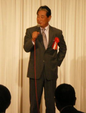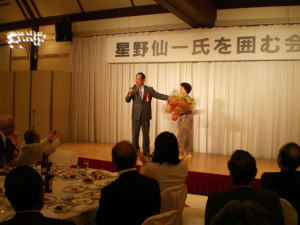 |  腰が痛むのでしょうか・・・   美人の同級生から 花束贈呈  お決まりの 私とのツーショット! これは はずせません♪ | 今回も 星野記念館の代表理事 延原敏朗氏が発起人 となり、この会を開催することになりました。 この日、星野氏は何年来続けている 旭川荘の慰問を終え、 その後この会に出席されました。 実は、前日から腰を痛めていて、立っているのもやっと と言う中壇上に用意されていた椅子をお断りして 立ったままスピーチをされました。 ファンの皆様のために 私が覚えている限りのことを、ここに書き残そうと思います。 ・・同級生が難病で、自力で学校に行けなかったので、 星野監督は小・中学校とその友達を背負って毎日学校に 通ったそうです。それがきっかけで未だに旭川荘の慰問を 続けているそうです。(最初に挨拶をされた方のスピーチより) 〜 星野監督のスピーチより 〜 まず最初に会場を見渡して、囲む会って言うより、地元に 帰って来て、同窓会みたいだ とおっしゃっていました。 ・・男は同情されたら終わり。 いつまでもひがまれたいと思う。 ・・草野球しか知らなかった少年が、ある日プロになった。 今日もこの会場に来られていますが、小学校の時の 担任の先生が、僕に勉強を教えずに野球ばかり教えた。 今あるのは 先生のおかげだと思っています。 ・・六大学でレギュラーは無理と思ってたけど・・・ ・・大学では、私はもっと端正な顔をしていました。 練習が厳しくて屋上に上がって、この顔をぐしゃぐしゃにして ポロポロ泣いて、明日帰ろう 明日帰ろうと、 おふくろの顔を思い出していた。 今思えばたいした事では ないんだけれど、そういう時期もありました。 ・・バットでやられたら ほんまに目から星が出る。 しごかれてなかば 夏までにやめる!と思っても、 そういう時に 日頃の根性が出る。 ・・オリンピックでメダルを逃した時は、批判されてたたかれて、 人はこうも変わるものか・・・と思った。 ・・チャンスがあれば、また みんなを ウルウルさせたいです けどね。 チャンスはなかなか来ない・・・ ・・でも 野球って ホント 素晴らしい! | |||||
