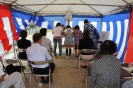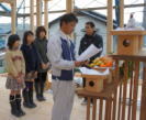 | 現場監督のお父さんが働く前で、娘たちもおばあちゃんも 敷物に腰を下ろして、自分たちの家の棟が上がっていく様子を お茶を飲みながら 眺めている。 こんな和やかな棟上げを 久しぶりに見たような気がします。 祝詞奏上はお父さん自ら。 |
