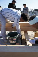 11/15/’10 ・棟が上がると、雨が降ってもいいように、まず 屋根から 仕上げていきます。 ・私は 小さい頃から 高いところに上がるのが 大好きデス。 なので 現場の棟梁に 設計士にしとくのはもったいない とよく言われます。 屋根の上は 絶景です。 |