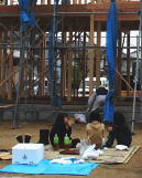 4/15/’11 、 ・久しぶりに大勢で打ち合わせです。なかなか現場に来れな い施主兼現場監督が妻同伴で、気合が入っています。 入れ替わり立ち代わり業者さんと打ち合わせです。 ・ちょっと お茶目な社長さんも進行状況の偵察?に。 |