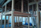 3/24/’11 、 ・和室の天井です。棟梁が頑張って、節のない綺麗な杉を 用意してくれました。 ・階段がつきました。今まで梯子で上がり降りしていましたが、 今日から楽チンです。 ・リビングの吹き抜けです。ダイニングとの間に引き込みの 大きな建具が入ります。 |