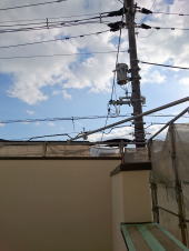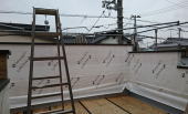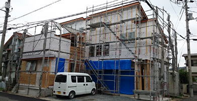 9/3/'15 ・外観のカタチが 見えてきました。 白く見えるのは 透湿・防水シートです。 ・家のすぐ南と東に 大きな電柱があり、 南面の外壁の すぐそばを 電線が集中しています。 ちょっと 怖いので 電磁波対策をすることにしました。 なんと 電磁波は 先進国の中でも日本がいちばん 強い国だそうです。 目には見えないものなので なかなかその部分に費用を かける方は少ないですが・・・ |