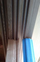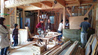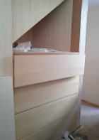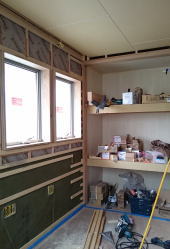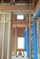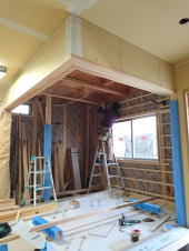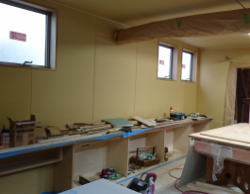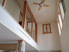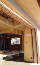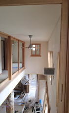 12/16/'15 ・寝室小窓から吹き抜けを見ると 正面は 夫の書斎です。 見下ろすと 玄関土間があり、薪ストーブがあります。 寒い夜、小窓を開けておくと、暖炉のぬくもりが この部屋 まで 届きます。 ・リビングの地袋が出来上がりました。 建具は 建具屋さんが作成中。 ・吹き抜けは開けっ放しにしておくと、 エアコンの冷暖房が 逃げていくので、ここにも建具がつきます。 鴨居が取り付けられています。 |