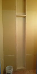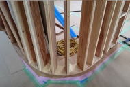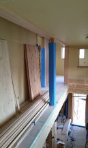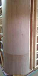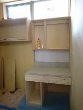 11/26/'15 昼の打ち合わせ ・2階トイレのニッチ収納です。 壁の厚みを利用して、収納棚を造ります。 トイレットペーパーや、お掃除用具をここに隠します。 ・2階の子ども室です。お子さまは二人。今はまだ 小さい ので、一部屋を一緒に使います。 将来、真ん中で仕切れるように、左右対称に物入れを 用意しています。 ・前回 まだ間柱で形取っていた、2階の廊下の角です。 下地ベニヤを 少量ずつアールに曲げたものを、張って います。 “ 匠 ” の技です。 |