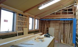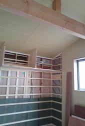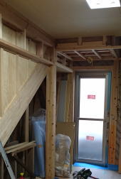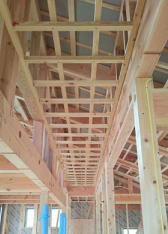 11/10/'15 庭師さんと打ち合わせ ・リビングの天井です。野縁に仕上げ材下地のプラスター ボードを 貼っています。 ・2階の子ども室です。 部屋は建物の北に位置して いますが、 南に面した 小屋裏物置から 南の太陽の 光を 取り込めるように 細工をしています。 出来上がってからの 光の入り方が 楽しみです。 ・2階の廊下の角です。 アールに仕上げて スムースに 曲がれるようにしています。 |