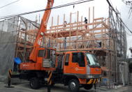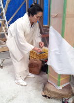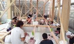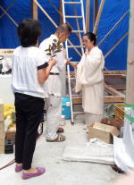 7/27/'15 上棟 ・連日猛暑の中、本日 曇り♪ これぞ 天の恵み。 ・10時の休憩の頃には 既に1階部分の梁があがって いました。大黒柱の基礎石も据えられています。 ・お昼は 施主サンのお友達 の “ KITCHEN SAKURA ” のお弁当♪ 岡山市中区 さい東町 2-1-16 こちらのシェフ、メニューにないものを注文すると、 『 あるよ 』 と言って 作ってくれるそうです♪♪ 美味しいワインも 取り揃えているそうなので、 是非 ディナーに行ってみたいと思っています。 ほかに お赤飯、おむすびと 汁物もご用意してくださり 食べきれないくらいの お昼ご飯でした。 今日は 曇りで本当によかった。 大工さんたちの 体力の消耗度が まったく違います。 ・午後からも サクサクと進んでいきます。 私も 高いところは大好きですが、さすがに屋根ダルキ の上を こんな風には 歩けません・・・ ![]() お隣の実家のワンコも 見守っています♪ ・棟があがりました。 施主さんが普段から信頼されている 拝んで下さる方が 岡山まで お越しくださり、棟上げの神事を執り行って くださいました。 拝んでいただいたお札は 工事の安全を祈願して 棟の高い所に 無事 取り付けられました。 |