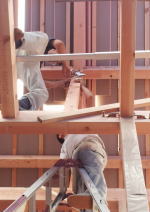 9/15/'15 ・ステージワイズの看板シートが 取り付けられました。 ・すべての壁に 断熱材が敷き込まれました。 断熱材は 種類・厚みなどによって 熱伝導率が かなり 違います。熱伝導率が低い方が 外気の温度が室内に 伝導しにくく、 その分価格も高くなります。 壁で覆ってしまえば 目には見えない部分ですが、 価格が高い家は それなりの理由があるということです。 |