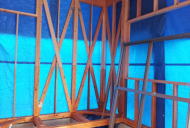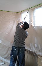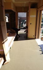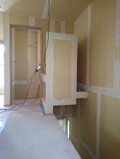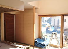 1/07/2016 ・内装屋さんが入っています。クロス貼りです。 ・ベランダの 流しコーナーは、防水のためのFRPが塗布 されています。 乾いたら 次は タイルを貼ります。 ・今回、玄関は木建引き込み戸です。 建具周りはリシン掻き落としの左官仕上げとなります。 木建もこれから色を付けるので、外壁との色の調和が とても楽しみです。 |