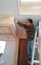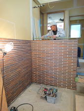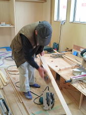 12/25/'15 ・薪ストーブ置場の壁タイルを施工中です。 この後目地を入れますが、この目地がとても味があるの です。 ・古い付き合いのM大工さん。 時々、応援に入ってくれます。70過ぎていますが、未だ 腕は お見事です。 子供部屋の木建の鴨居を造っているところです。 ・薪ストーブの外部側の煙突が取り付けられました。 |