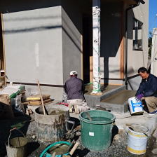 1/15/'16 ・今日は左官屋さんが入っています。 内部は マーブルフィール、ドイツ漆喰です。 湿度を適度に保つ、結露を防止する、天然素材のみで 合成樹脂などの 化学物質を含まない、火にかざしても 燃えない、万が一火災の時でも有毒ガスを発しません。 ・ベランダの 流しコーナーに タイルが貼られました。 ・外壁のリシン掻き落としが仕上がり、玄関木建も塗装が 終わりました。艶やかな上品な仕上がりです。 |