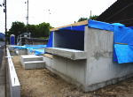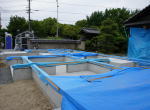 5/26/’11 土台確認 ・明後日 上棟日を迎えるのですが、最近よく雨が降る ので、きっちりビニールシートで覆っています。 ・手前の背の高い基礎は浴室の壁です。飛び出ているのは 打ち放しで仕上げた出窓の下台です。 ・ビニールシートの中に入って、土台の確認をしました。 |