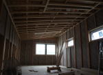 8/8/’11 ・北側 ファサード。ラス地(木摺り)姿の外観。 ・東側 ファサード。同じくラス地姿の外観。 このままでも充分美しいのですが、残念ながらこのままだと 建物が風邪をひいてしまうので、衣装を着せててあげます。 ・天井に野縁が施工されています。この上に仕上げ下地の プラスターボードを張ります。整然とした木の下地材が 見れる、一番綺麗な時期かもしれません。 |