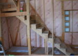 2/09/’13 ・和室の天井に野縁が組まれています。 この上に 天井仕上げの下地材 プラスターボードを 貼ります。 ・浴室 壁の 胴縁です。電気配線等終わると 壁&天井 は 急ピッチで 塞がれていきます。 ・階段が取り付けられました。今までは 梯子で登っていた ので、階段ができると ホッとします。 |