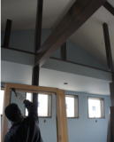 3/16/’13 ・造作家具の木建具 取り付け中。 悩んでいるのか・・・悦に入ってるのか・・・(笑) ・塗装工事が どんどん進んでいます。建具・額縁・ 化粧梁・化粧柱・家具・床・巾木などなど。 ・外壁の吹きつけ、車庫板張りの塗装も いい色に 仕上がっています。 本日 いよいよ 足場 解体デス。 |