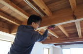 7/08/'15 ・もともと倉庫として建てていたので、耐力壁が少なく、 今回は、耐力壁を補いながらの工事となりました。 ・約 間中(まなか) 半間ですが、増築します。 増築する部分に、トイレと洗面コーナー、食品庫を設置 します。快適なトイレになるはずです♪ ・この現場をやってくださっている 古川大工サン。 ・お手伝いの大工サン、長年の埃を 丁寧に掃き落して くれています。 |