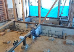 6/2/2017 ・土手道の大金鶏菊は 今が満開。 ・残すはずの柱を 施主のどうしてもという願いで、 撤去することに。 構造的には 不可能ではありませんが、 自分としては 邪魔な1本の柱を それでも過去の 歴史を刻むものとして 家族の生活の中に残した かったのですが。 ・撤去した柱の代わりに 場所を変えて柱を建て、 撤去した柱が支えていた梁を 新たな柱で支えた 新たな梁で荷重を受けます。 土台が施工されています。断熱材を敷き込んで、 床の下地合板を張ります。 |